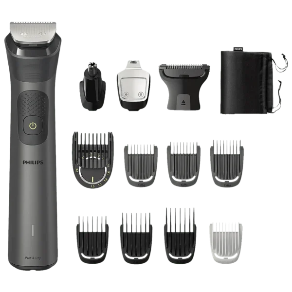 • Attachments: 1 x Steel Trimmer, 1 x Nose and Ear Trimmer, 1 x Body Shaver With Skin Protector, 1 x Steel Precision Trimmer, 1 x Precision Trimming Comb, 3 x Beard Combs, 3 x Hair Combs, 1 x Body Comb