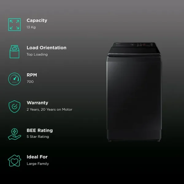 SAMSUNG 13 kg 5 Star Inverter Fully Automatic Top Load Washing Machine (WA13CG5886BVTL, Diamond Drum, Black Caviar)