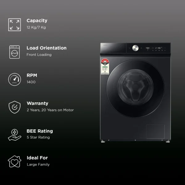 SAMSUNG 12/7 kg 5 Star Wi-Fi Inverter Fully Automatic Front Load Washer Dryer (8 Series, WD12FB8B94GBTL, AI Control Display, Black)