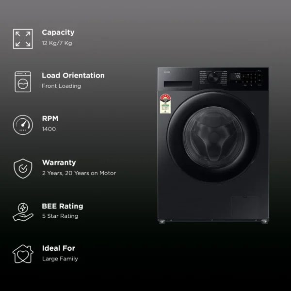 SAMSUNG 12/7 kg 5 Star Wi-Fi Inverter Fully Automatic Front Load Washer Dryer (5 Series, WD12FG5B34BBTL, Hygiene Steam, Black)
