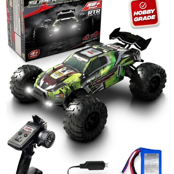 - The RC car is equipped with a high-performance 4-wheel drive system, powerful carbon brushed motor, and lithium-ion battery, allowing for maximum speed of 45 km/h, responsive and stable steering, smooth handling, and great off-road capabilities. Suitable for professional level hobbyists, ages 8 and up.