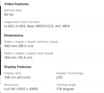 | Included Components | 1 LED TV, 1 Table Top Stand, 1 Wall Mount Bracket, 1 Remote Control |