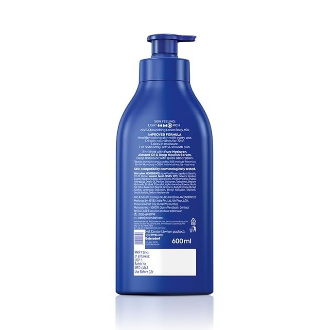 NIVEA Nourishing Body Milk 600ml Body Lotion with Hyaluronic Acid | 72Hr Hydration | Deep Moisture Care for Very Dry Skin | Enriched with Almond Oil | Smooth, Radiant & Healthy Looking Skin Care