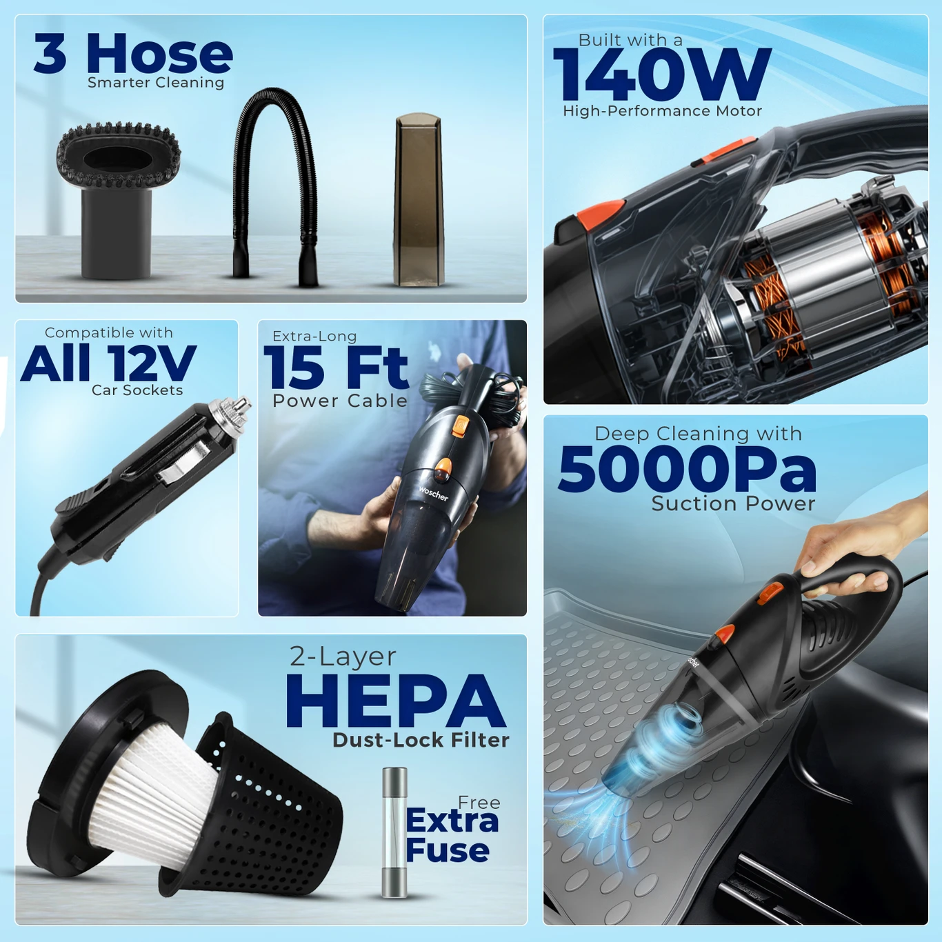 2003 140 VACCUM MOTOR &5000 PA POWERFUL SUCTION 15 FT CORD WITH HEPA FILTER CAR VACCUM CLEANER BLACK[AA1098/24]