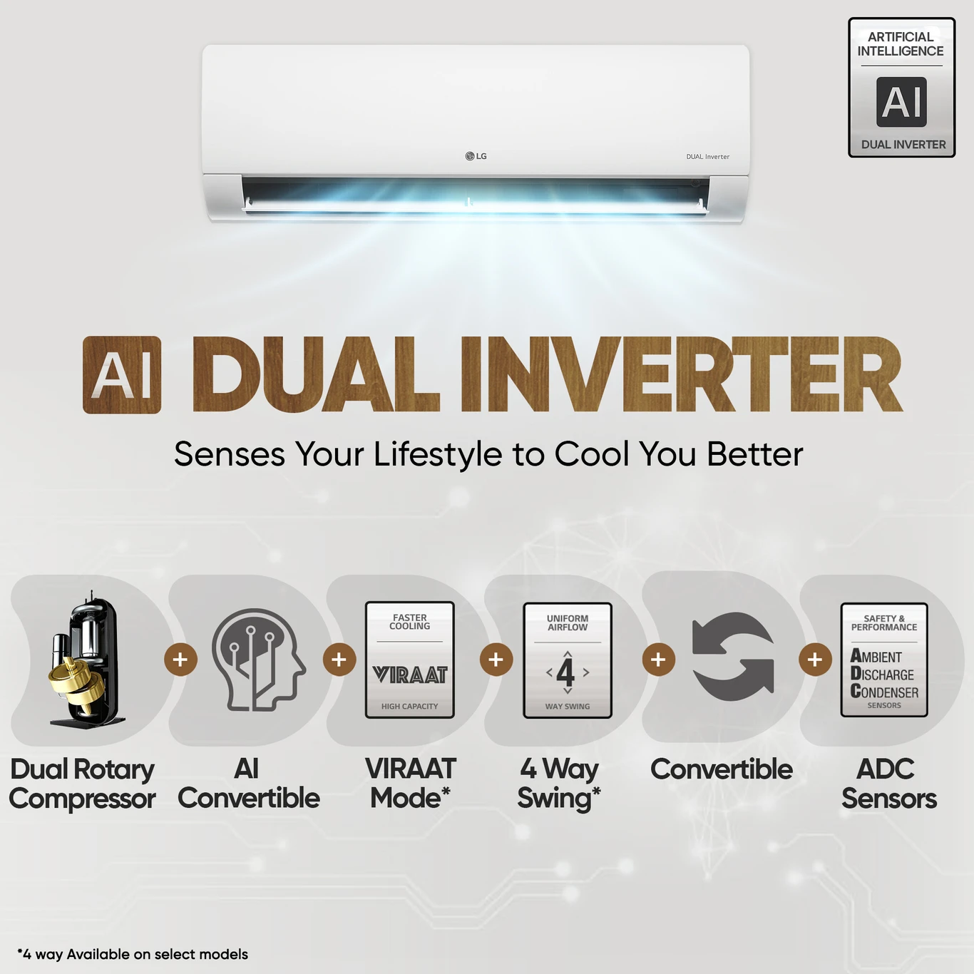 LG 1.5 Ton 5 Star DUAL Inverter Split AC (Copper, AI Convertible 6-in-1, VIRAAT Mode, Faster Cooling & Energy Saving, 4 Way Swing, HD Filter with Anti-Virus Protection, US-Q19YNZE3, White)(Non Wi-Fi Split AC YNZE3 – 2025) [AA1096/2]