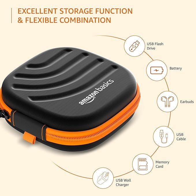 Amazon Basics Earphone Carrying Case – Multi Purpose Pocket Storage with Carabiner Hook, Travel Organizer for Earphones, Pen Drives, Memory Card, Cable (Black) (AA1102/26)
