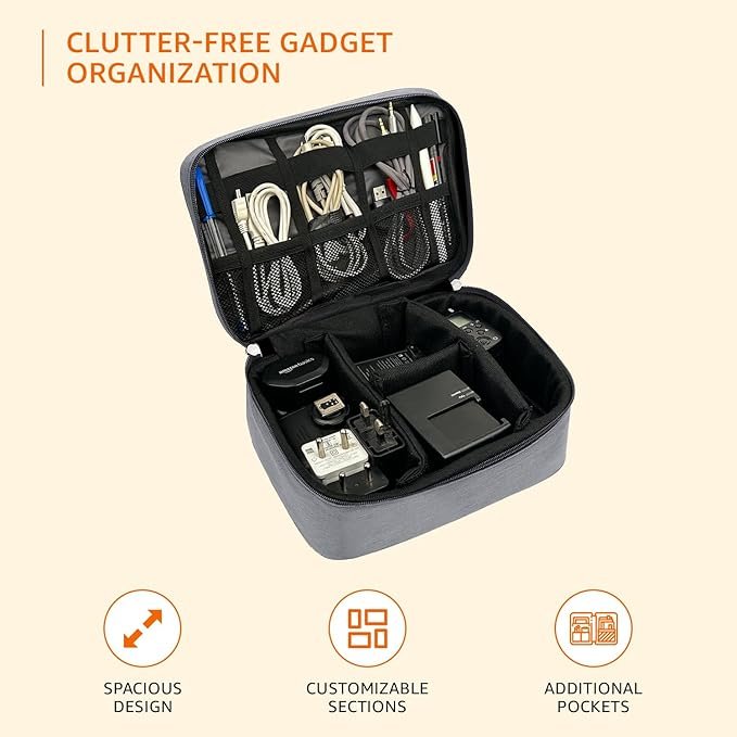 Amazon Basics Travel Organiser for Electronic Accessories, Flexible Padded Dividers, Waterproof, Foam Padding, for Cables, Chargers, Hard Disk, Power Bank (Grey) (AA1102/28)