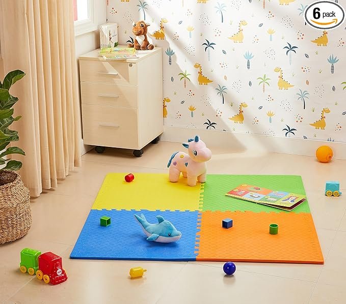 Amazon Brand – Supples Interlocking Eva Foam Mat | Pack of 6 & 8 | 1.2 cm Thick | 60 x 60 cm | Activity Mat for Kids 6+ Months | for Home, School & Playground | Durable &Easy Storage | Multicolor (AA1102/45)