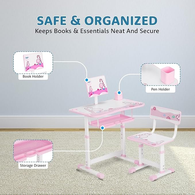 Amazon Brand – Supples Study Table for Kids | Suitable for 3-12 Years | Kids Study Table with Height Adjustable Table & Chair, Book Storage & Pen Holder | Pink &Blue | Candy Print (AA1102/41)