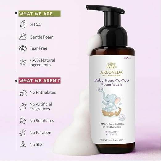 AreoVeda Baby Head-To-Toe Foam Wash With Self-Foaming Pump (500ml) I Tear-Free Baby Wash I 24 Hrs Hydration I pH 5.5 With PENTAVITIN® & Aloe Vera I Safe from Day 1 I Lab Tested, Ecocert Certified, EWG Verified