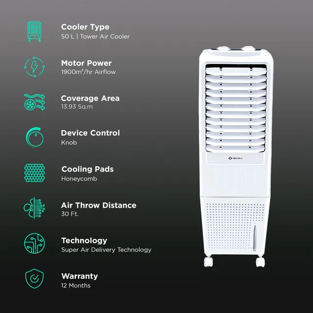 BAJAJ 50 Litres Tower Air Cooler with Typhoon Blower Technology (Anti Bacterial Hexacool Master, White)