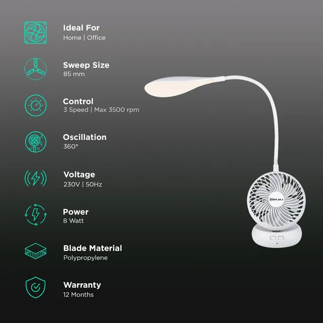 BAJAJ Air Light 85mm 7 Blade Rechargeable Personal Fan with 1800 mAh Battery (Low Power Consumption, White)