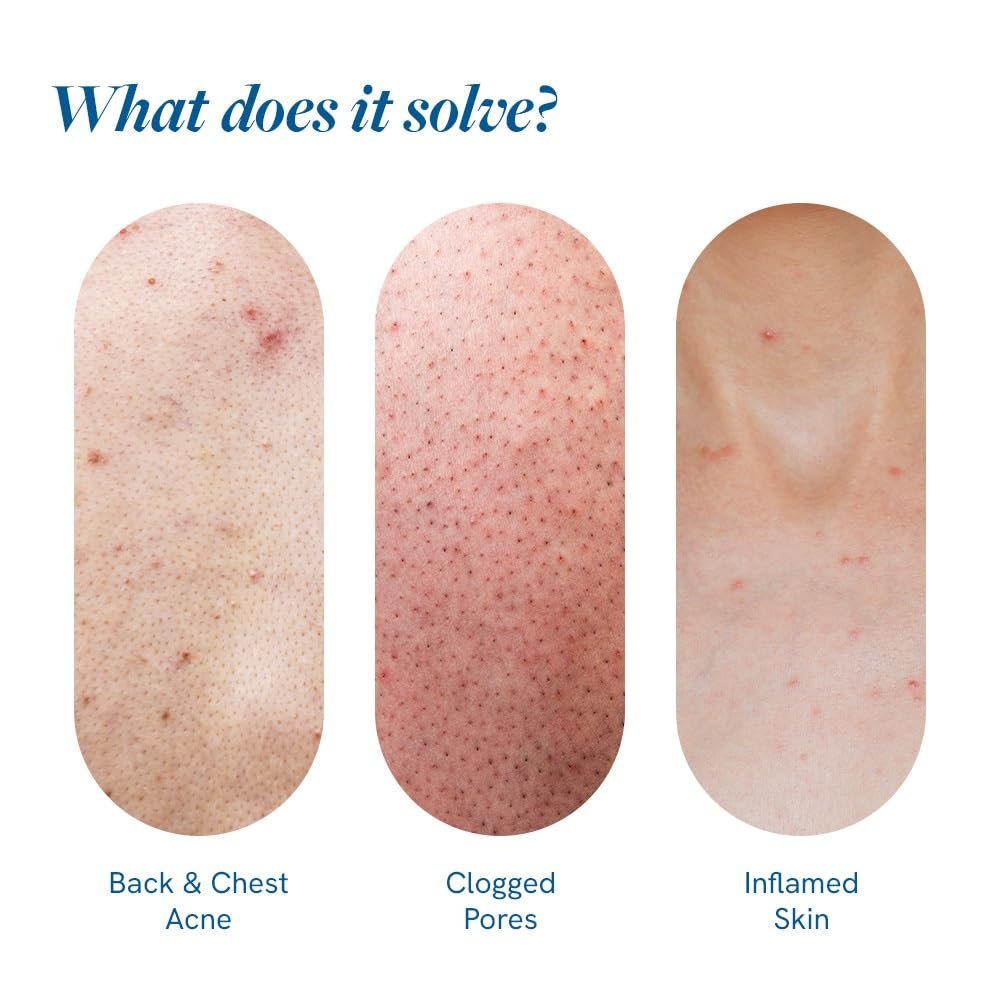 - Exfoliates & Unclogs Pores – Helps shed dead skin cells and remove trapped sebum, leaving your back, chest, and shoulders visibly clearer and smoother.