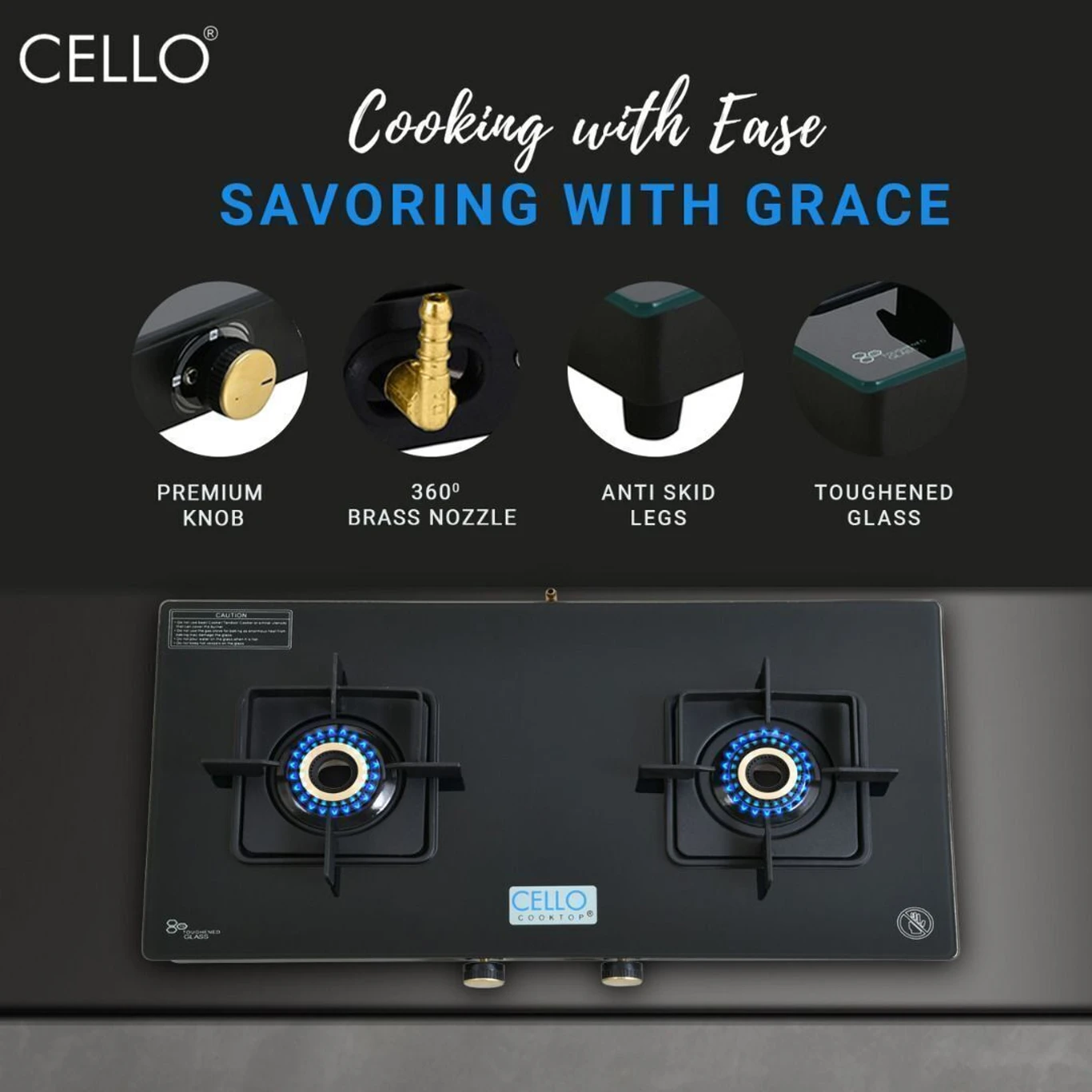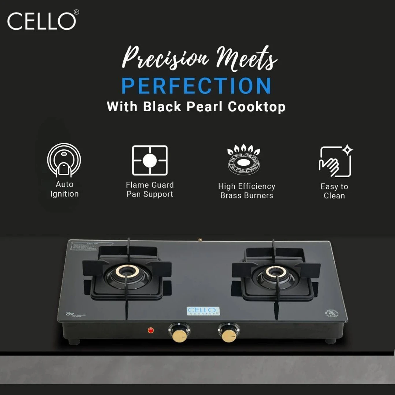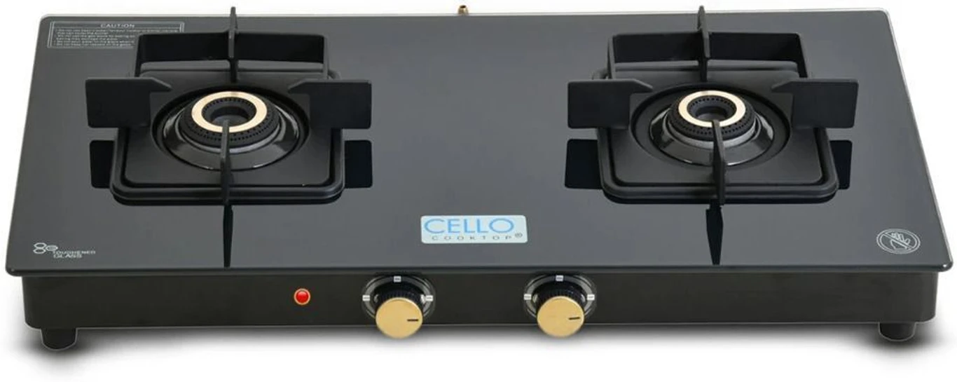 Black Pearl 2 Burner Toughened Glass Top Gas Stove, Brass Burners, Black Finish Glass Automatic Gas Stove (AA1104/189)
