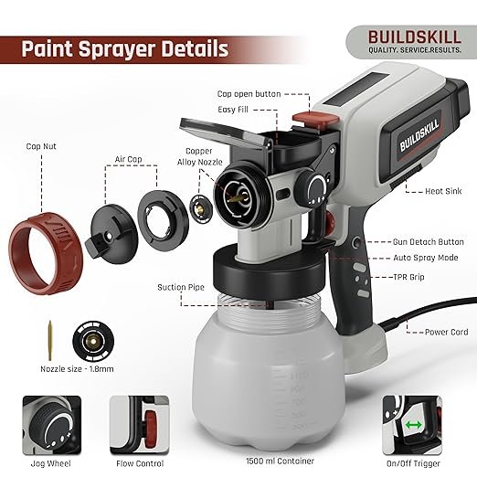BUILDSKILL Easy Refill Paint Sprayer | 1500ML Large Tank | 600W Copper Motor with 32000RPM Speed | Heat Sink | 3 Patterns | Copper Alloy Nozzle | Auto Paint Spray Machine for Home & Professional Use9(AA1104/122)
