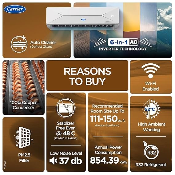 Be the first to review “Carrier 1.5 Ton 3 Star Wi-Fi Smart Flexicool Inverter Split AC (Copper, Convertible 6-in-1 with Wi-Fi with Geo-Fencing, Smart Energy Display, 2026 Model, ESTER EDGE Gxi WiFi-CAI18EE3R36W0, White) (AA1104/142)” Cancel reply