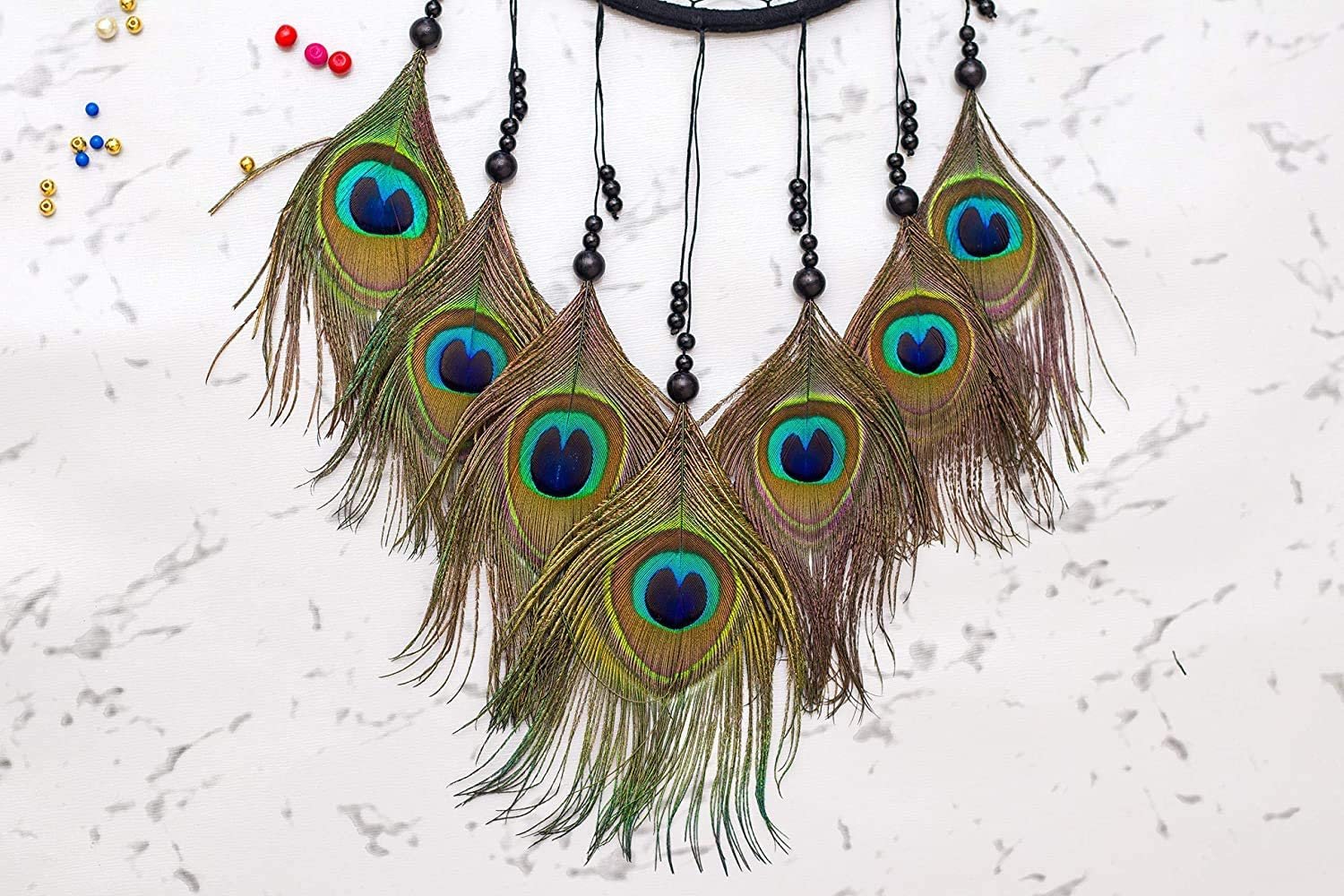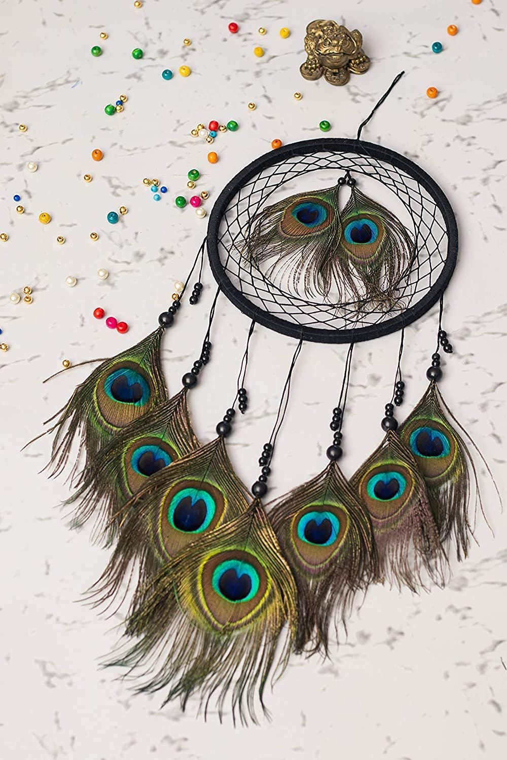 Colour Black Brand THE URBAN CRAFTIQUE Occasion Home Decoration Material Thread, Beeds, Wooden ring & Peacock Feather Theme Traditional Cartoon Character Traditional Dream Catcher Style Traditional Product Dimensions 2D x 25W x 35H Centimeters Target Audience Adult Included Components Dream Catcher