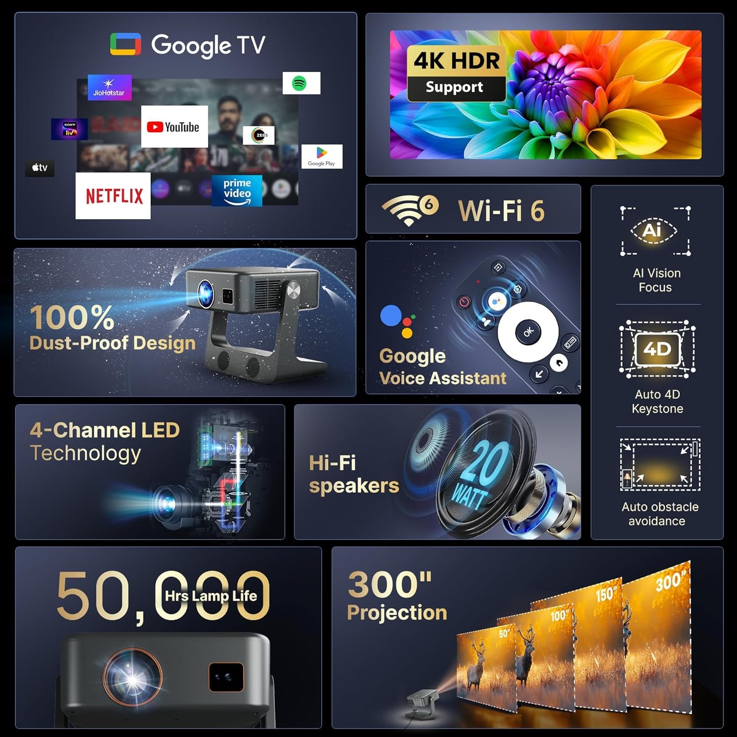 Crossbeats Lumex Solis Projector 4k Ultra HD, [Google TV Official], 1080p Native, Android OS WiFi, 1000 ANSI, Smart Mini Projector for Room, Portable Home Theater Cinema, Built-in Apps, 300”Display