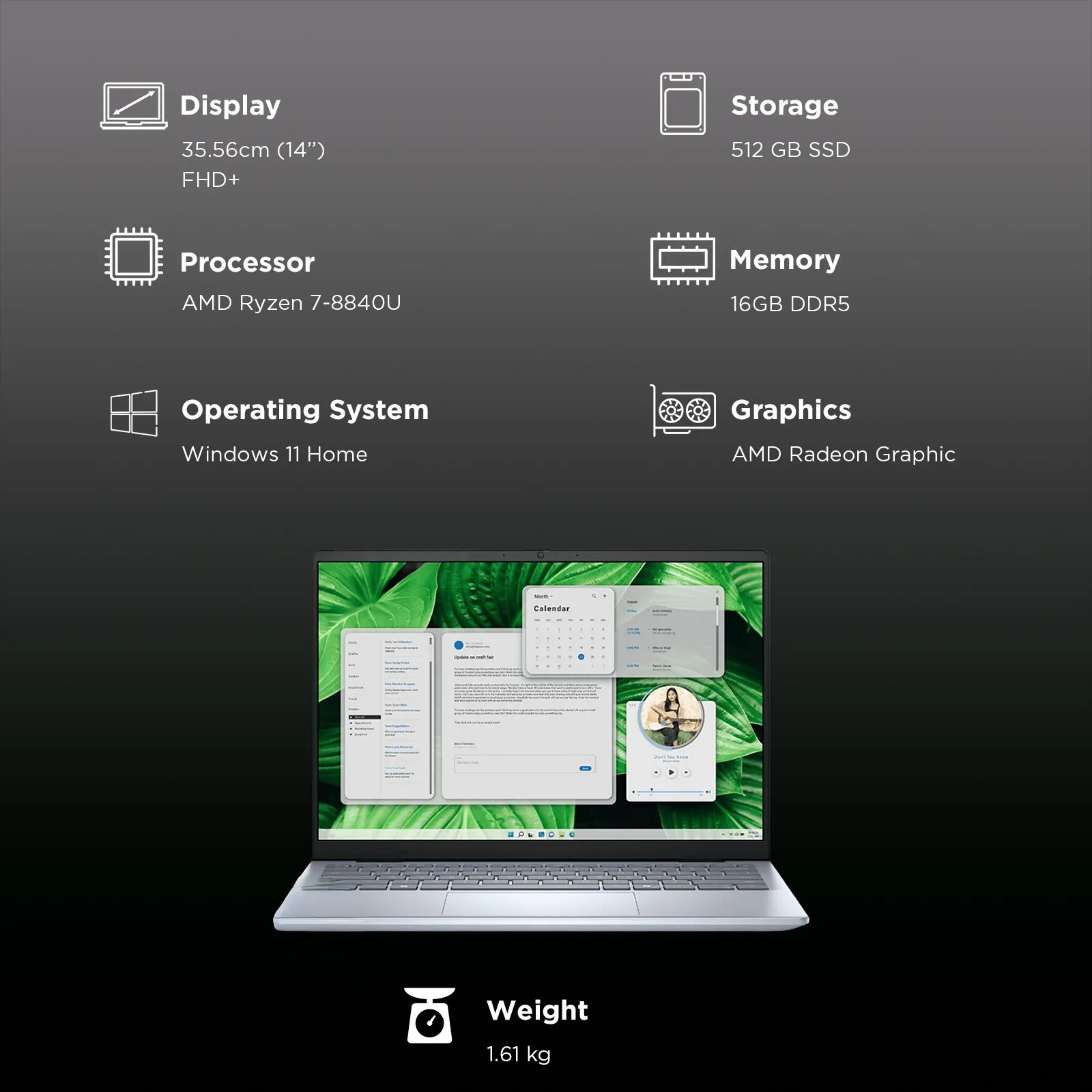DELL Inspiron 5445 AMD Ryzen 7 8840U 8th Gen Thin & Light Laptop (16GB, 512GB SSD, Windows 11 Home, 14 inch FHD Plus Display, MS Office 2021, Ice Blue, 1.61 KG)
