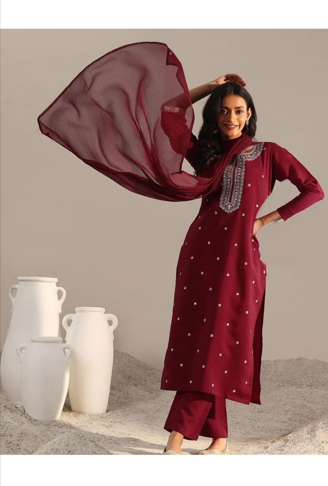 Floral Embroidered Round Neck Sequinned Straight Kurta With Trouser & Dupatta