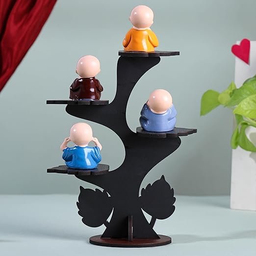 FlowerAura Decorative Set of 4 Adorable Buddha Monk Figurines With Wooden Stand For Peaceful Home Decor & Office Decor, Special Gifting, Ideal for Living Room, Meditation Spaces, and Special Occasions