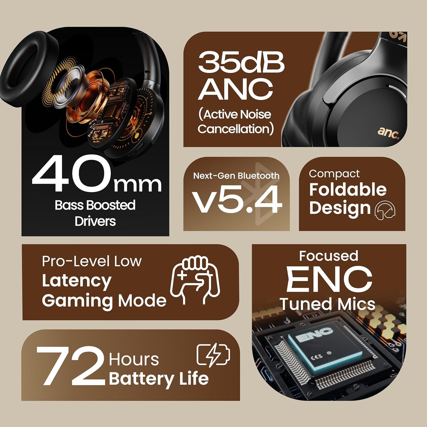 GOBOULT New Newly Launched Anchor Bluetooth Wireless Over Ear Headphones with Mic, Active Noise Cancellation, 72H Playtime, AUX, Type-C Fast Charging, 40mm Bass Drivers, ANC Headphones [AA1102/147]