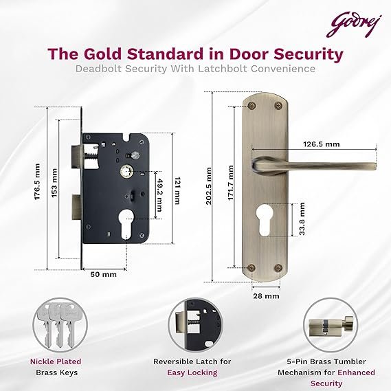 Godrej Mortise Lock I Handle Set 1CK EM02 I 6-Lever Lock I 3 Keys I Double Throw I 5″ Handle I Left/Right Handed Door Operation| for Office & Internal Doors | Antique Brass Finish I 5 Year Warranty[AA1100/40]