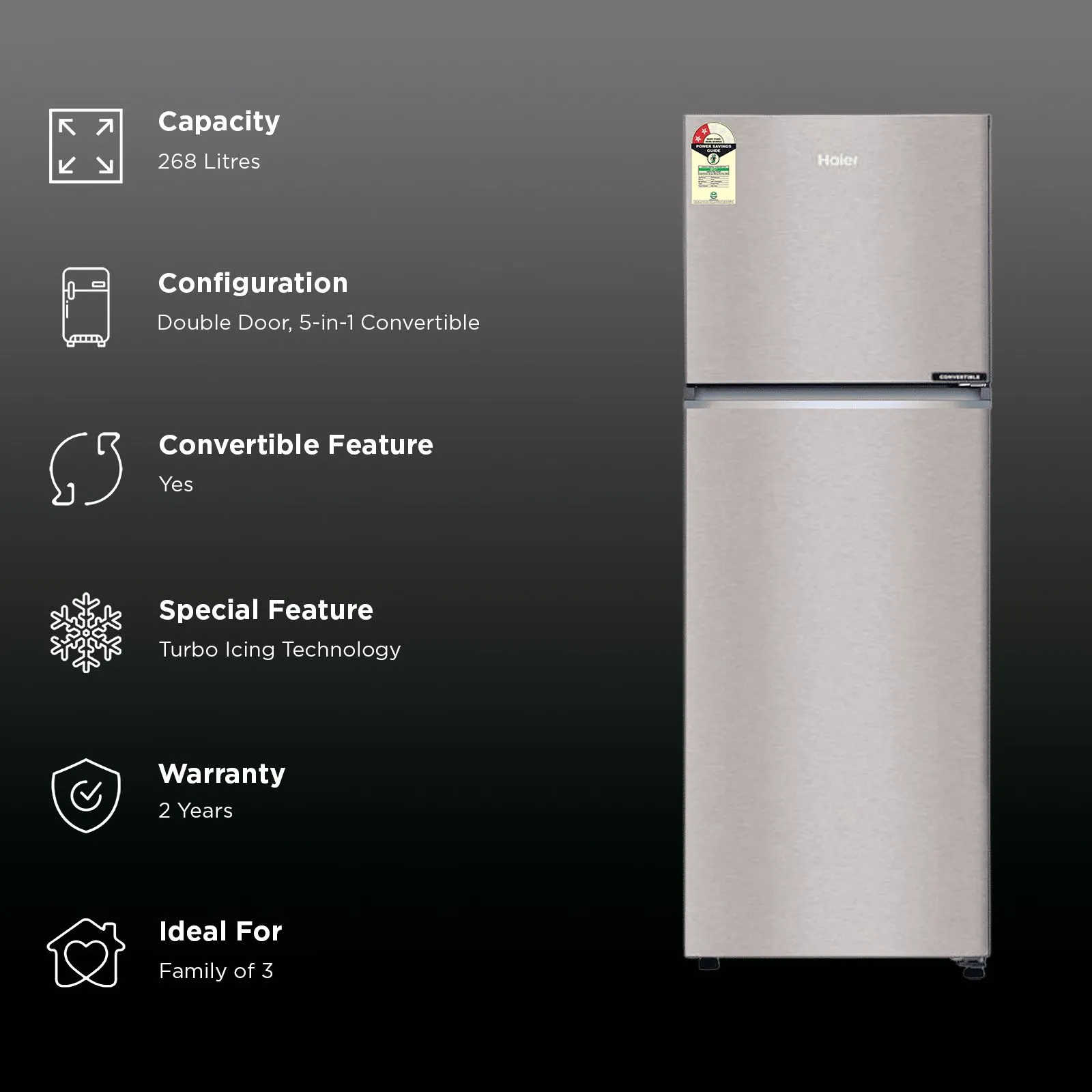 Haier 268 Litres 2 Star Frost Free Double Door Convertible Refrigerator with Turbo Icing Technology (HRF-3182IBNS-P, Nickel Steel)