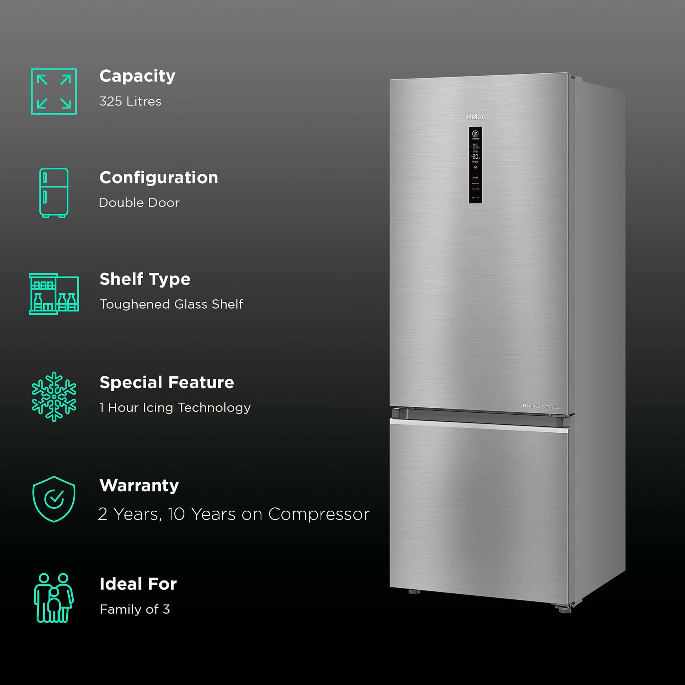Haier 325 Litres 3 Star Frost Free Double Door Bottom Mount Convertible Refrigerator with Triple Inverter Technology (HRB-3753BBS-P, Brushline Silver)