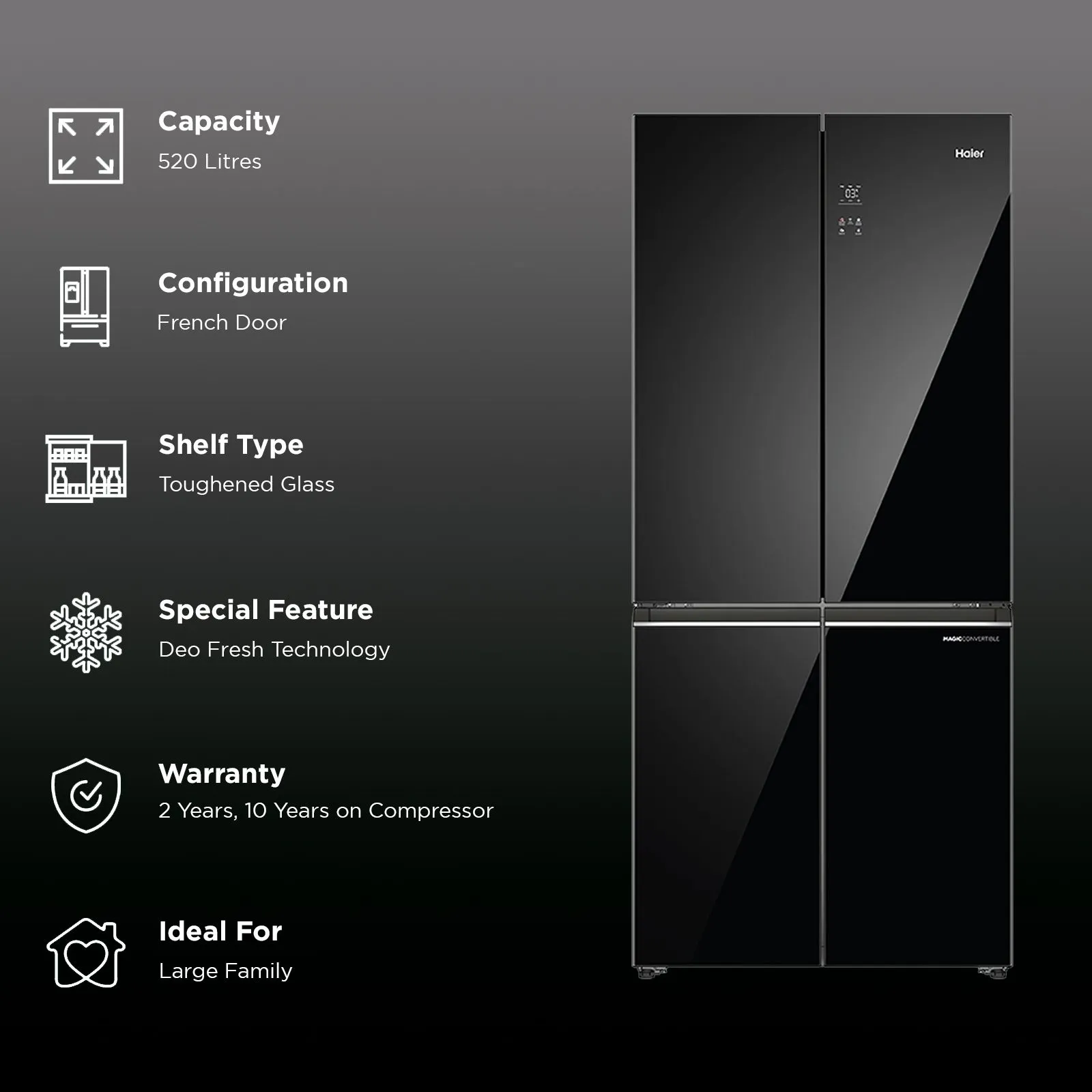 Haier 520 Litres 3 Star Frost Free French Door Convertible Refrigerator with Colorful Digital Display Panel (HRB-600KGU1, Black Glass)