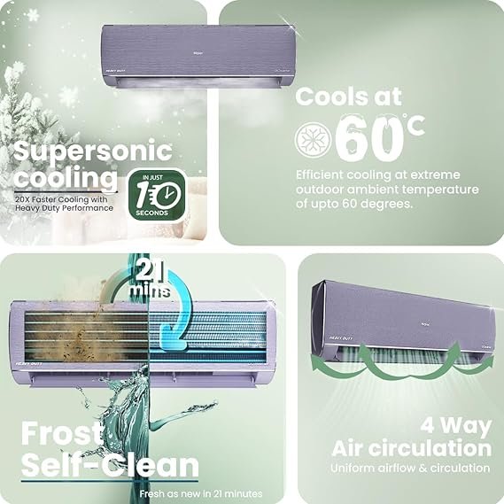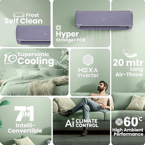 Be the first to review “Haier Gravity Series 1.6 Ton 5 Star AI Climate Control Smart Split AC (5460 Watts, HEXA Inverter, Copper, Fabric Finish, Wi-Fi, 4-Way, HD Filter, Cools at 60°C-HSU19G-MZAID5BN-INV, Galaxy Slate) [AA1096/25]” Cancel reply