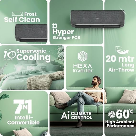 Be the first to review “Haier Gravity Series 1.6 Ton 5 Star AI Climate Control Smart Split AC (5460 Watts, HEXA Inverter, Copper, Fabric Finish, Wi-Fi, 4-Way, HD Filter, Cools at 60°C-HSU19G-MZAIP5BN-INV, Midnight Dream) [AA1096/26]” Cancel reply