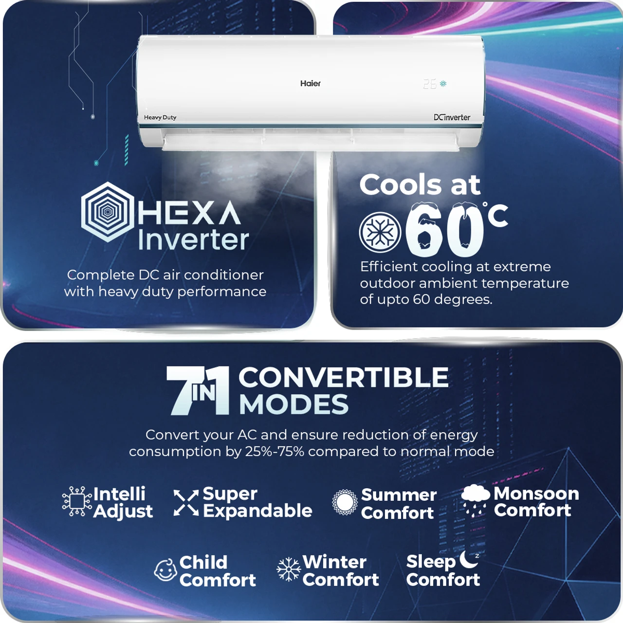 - Split AC with Intellisense inverter compressor: variable speed compressor which adjusts power depending on heat load. 4-in-1 Convertible with 4 cooling cooling modes through remote control to operate in different tonnages for different cooling needs