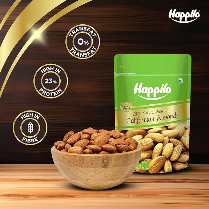Happilo Premium Natural Californian Almonds 200g | Badam Giri, Healthy Snacks, Dry Fruits | Crunchy Nuts | High in Fiber | Rich in Protein | Magnesium | Phosphorus | Dietary Fibre | Zero Cholesterol (AA1104/26)