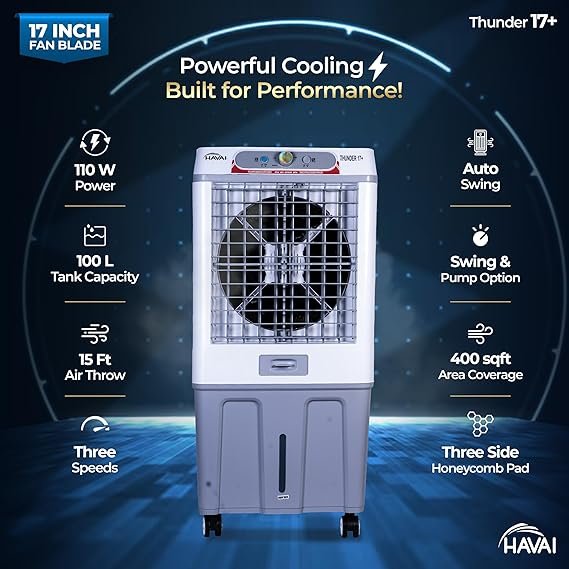 HAVAI Thunder 17+ Desert Cooler | 100L Tank | 17-Inch Fan Blade | 3-Side Honeycomb Pads | Heavy-Duty 110 Dia 32mm Motor | Auto Swing | 1-Year Motor Warranty & Post-Warranty Service | White & Brown