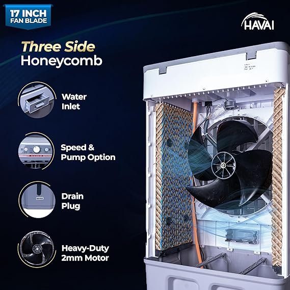 HAVAI Thunder 17+ Desert Cooler | 100L Tank | 17-Inch Fan Blade | 3-Side Honeycomb Pads | Heavy-Duty 110 Dia 32mm Motor | Auto Swing | 1-Year Motor Warranty & Post-Warranty Service | White & Brown