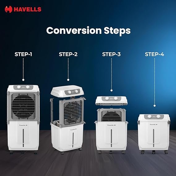 Havells 2-in-1 Convertible 80 L Desert Air Cooler for room| Dual functionality & easy storing| Can be used as side table| 5 Leaf Metal Blade Fan| Powerful Air-Delivery| Bacteria shield honeycomb pads