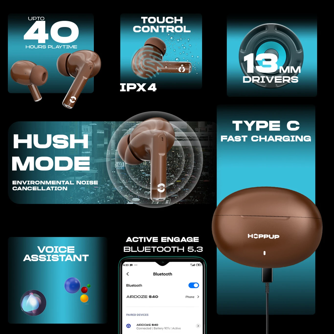 HOPPUP AirDoze S40 Earbuds with 13MM Drivers, 40H Playtime, Rage Mode,ENC & Type-C Bluetooth (Chocolate Brown, True Wireless)