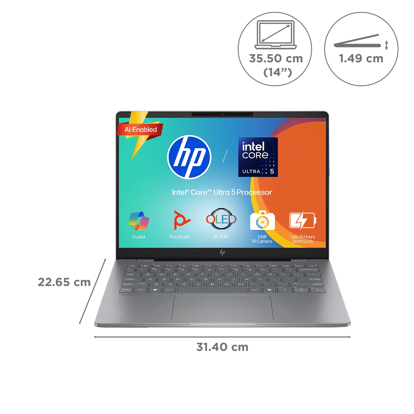 HP OmniBook 7 Intel Core Ultra 5 Laptop (16GB, 512GB SSD, Windows 11, 14 inch 2K OLED Display, MS Office 2024, Meteor Silver, 1.41 KG)
