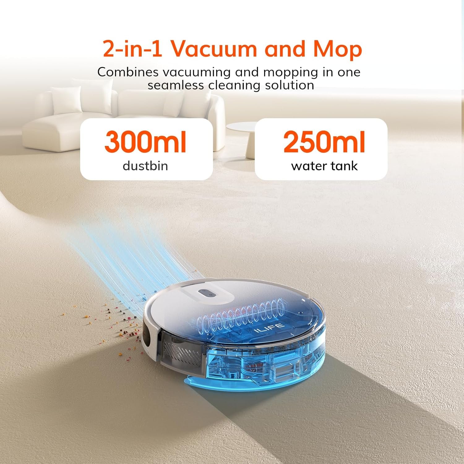 - 2-in-1 Vacuum & Mop: ILIFE V20 robot cleaner is a versatile vacuum cleaner and mop for home. It features a 300ml hybrid dust tank and a 250ml water tank, allowing it to vacuum and mop simultaneously. This 2-in-1 function saves you time and effort by cleaning your floors in one step, making it a practical choice for homeowners who want a comprehensive cleaning solution.