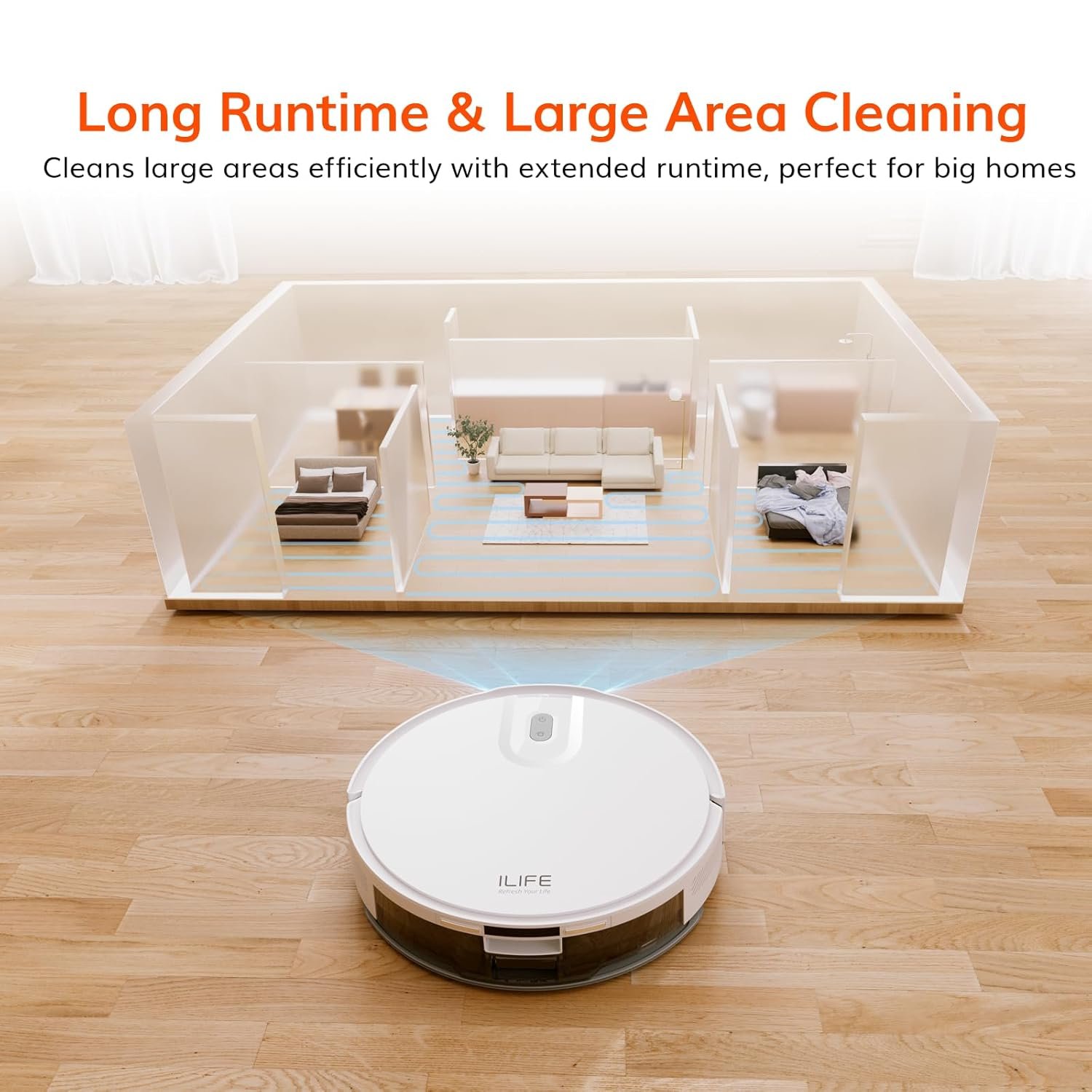- 5000Pa Suction Power: With a powerful 5000Pa suction, the ILIFE V20 vacuum cleaner and mop handles all types of flooring, including tiles, hardwood, and carpets. It effortlessly picks up dust, pet hair, debris, and more, thanks to its brushless motor. The robust suction power, combined with a long-lasting battery, ensures the robot cleaner can clean large areas on a single charge.