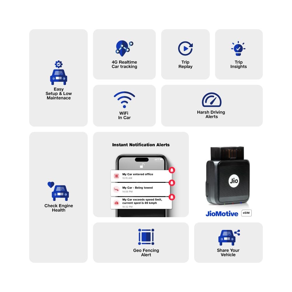 Be the first to review “JioMotive OBD GPS Tracker & Wi-fi Router| 4G eSIM Plug n Play| Instant On/Off, Geo Fencing Alerts| 1 Year Free Subscription| Jio Locked | for Personal Cars & Small Fleets (Upto 5 Cars) [AA1102/210]” Cancel reply