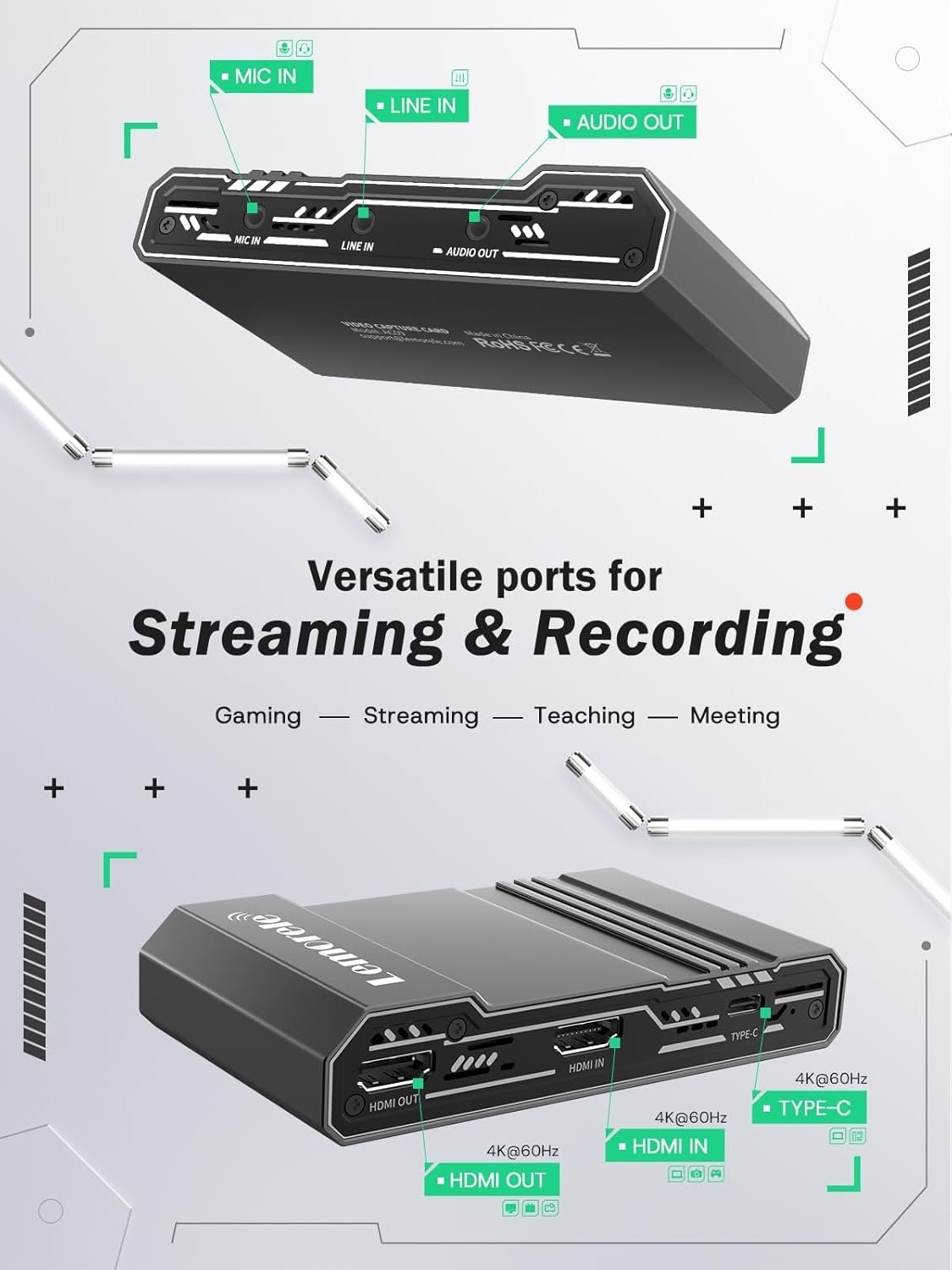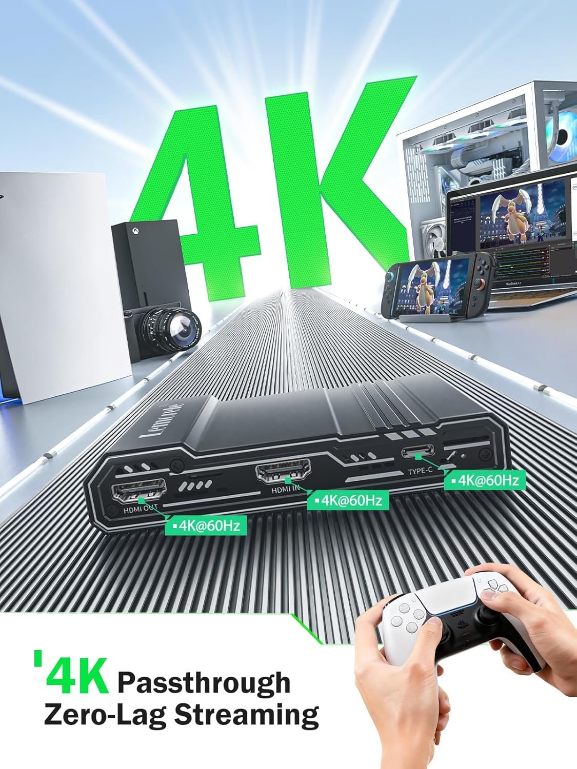 Lemorele Video Capture Card,4K 60fps Ultra-Low Latency Output, USB-C(Capture) with Mic/Line Input Audio Interfaces, It is Compatible with Switch, PS4, PS5, Laptops, Phone, PCs, and Macs [AA1102/230]