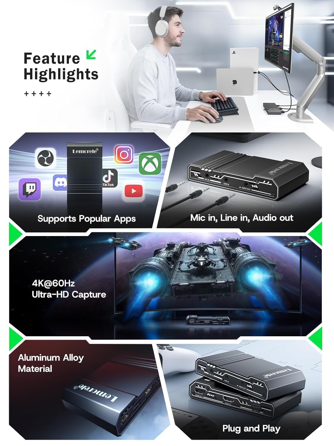 Be the first to review “Lemorele Video Capture Card,4K 60fps Ultra-Low Latency Output, USB-C(Capture) with Mic/Line Input Audio Interfaces, It is Compatible with Switch, PS4, PS5, Laptops, Phone, PCs, and Macs [AA1102/230]” Cancel reply