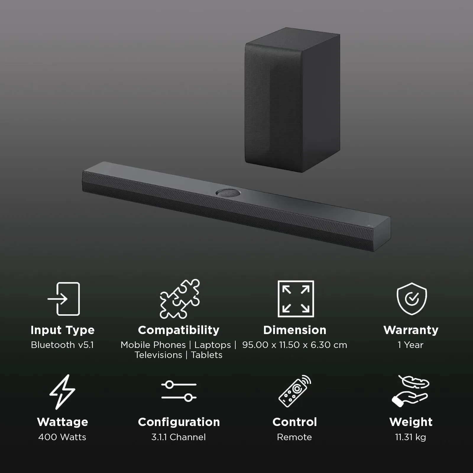 LG S70TY 400W Bluetooth Soundbar with Remote (Dolby Digital, 3.1.1 Channel, Black)
