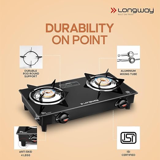 Longway Furn Glass Top, 2 Burner Manual Ignition Glass Gas Stove (Black, ISI Certified, 1 Year Warranty)
