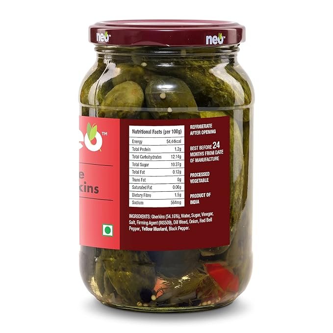 Neo Whole Gherkins 480g I Pack of 1 I 100% Plant Based I Low Fat Sweet and Crunchy Pickles, Ready to Eat I Enjoy with Nachos, Make a Healthy Salad at home (AA1104/265)