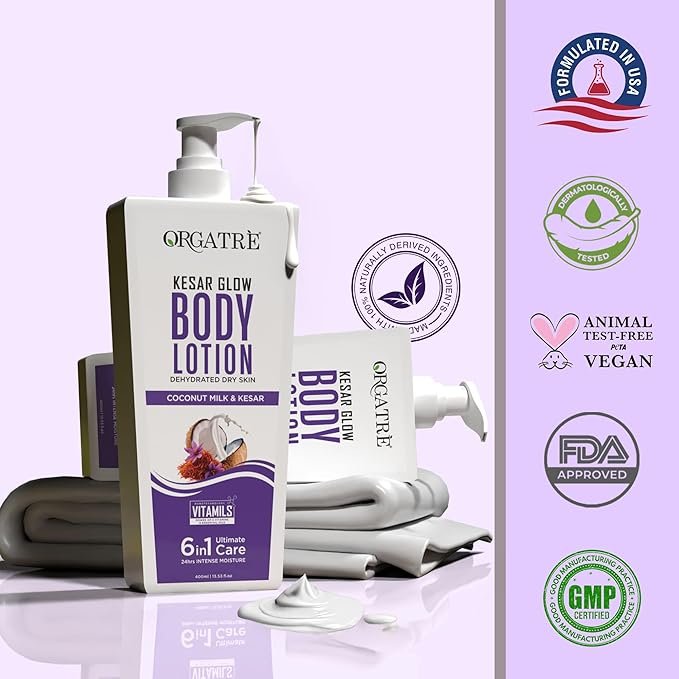 Orgatre Body Lotion with Honey, Almond, Kesar & Alovera | Deep Moisturizing for Dry Skin | For Men & Women | Soothes, Protects & Revitalizes | 24-Hour Intense Hydration – 400ml (Kesar)