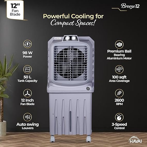 HAVAI Breeze-12 Personal Air Cooler | 50L Tank | 12″ Blade | Ideal for 100 sq ft Rooms | 98W Power | 8 ft Air Throw | 2600 RPM | Auto-Louver | 3-Speed | 1-Year On-Site Warranty (Grey)