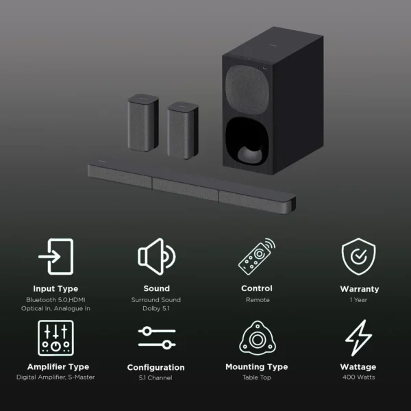 SONY HT-S20R 5.1ch Home Theatre with Digital, Subwoofer, Rear Speakers, 400 W Bluetooth Soundbar ( Black, 5.1 Channel) [AA1102/300]